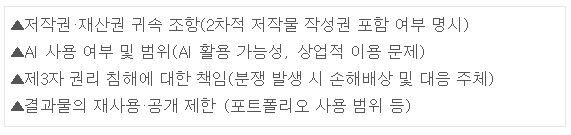 현행 법 체계상, AI가 단독으로 생성한 결과물은 저작권 보호대상이 되기 어렵고, 인간의 창작적 개입이 어느 정도 있었는지에 따라 법적 평가가 달라질 수 있습니다. 특히 외주업체나 프리랜서가 본인 계정의 AI 도구를 사용해 작업한 경우에는 해당 AI 서비스의 이용약관에 따라 상업적 이용이나 권리 귀속이 제한될 가능성도 있습니다.