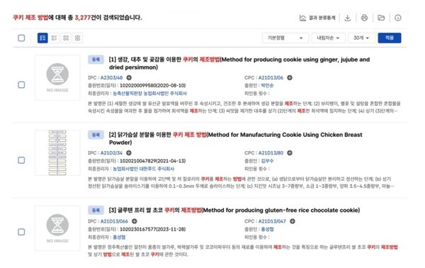 ‘쿠키 제조방법’을 검색해보면, 약 10,083건의 특허가 출원이 됐으며, 이중 등록된 특허권은 3,277건입니다.