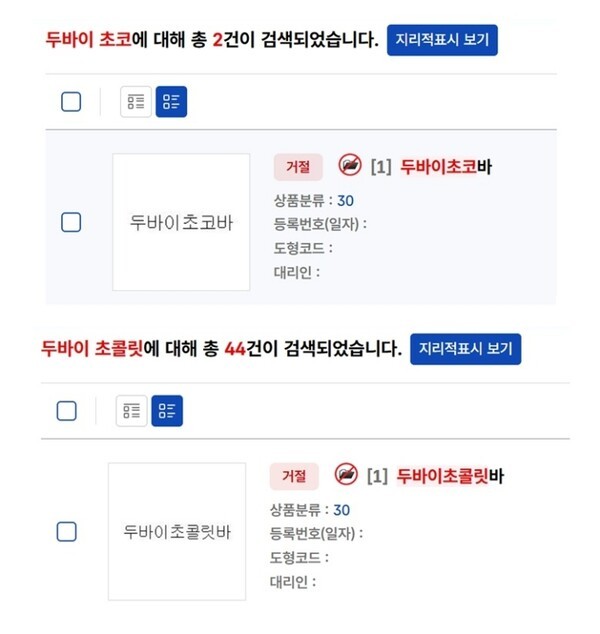 특허청은 2024년 ‘두바이초코바’, ‘두바이초콜릿바’ 등의 상표 출원을 식별력 부족을 이유로 거절한 전례가 있습니다.