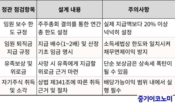 임원 소득의 모든 전략은 결국 정관이라는 법적 근거가 뒷받침되어야 한다. 정관에 명시되지 않은 급여 인상, 보너스, 퇴직금 지급은 세무조사 때 부당행위계산부인이라는 위험이 따른다.