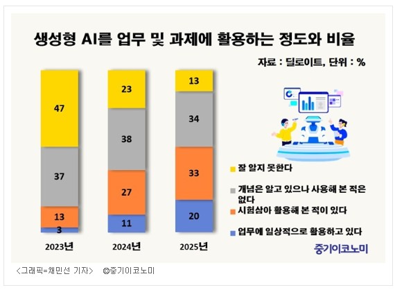 활용 목적 역시 개인 영역에 머물지 않는다. 개인적 용도가 여전히 주류이지만, 업무 활용 비율은 2023년 6%에서 2025년 34%로 급증했다. 글쓰기와 편집, 조사와 요약, 개념 설명 등 사무 전반에 AI가 활용되고 있다는 의미다. 직장인의 절반 이상은 생성형 AI가 생산성을 크게 또는 어느 정도 향상시킨다고 평가했다.